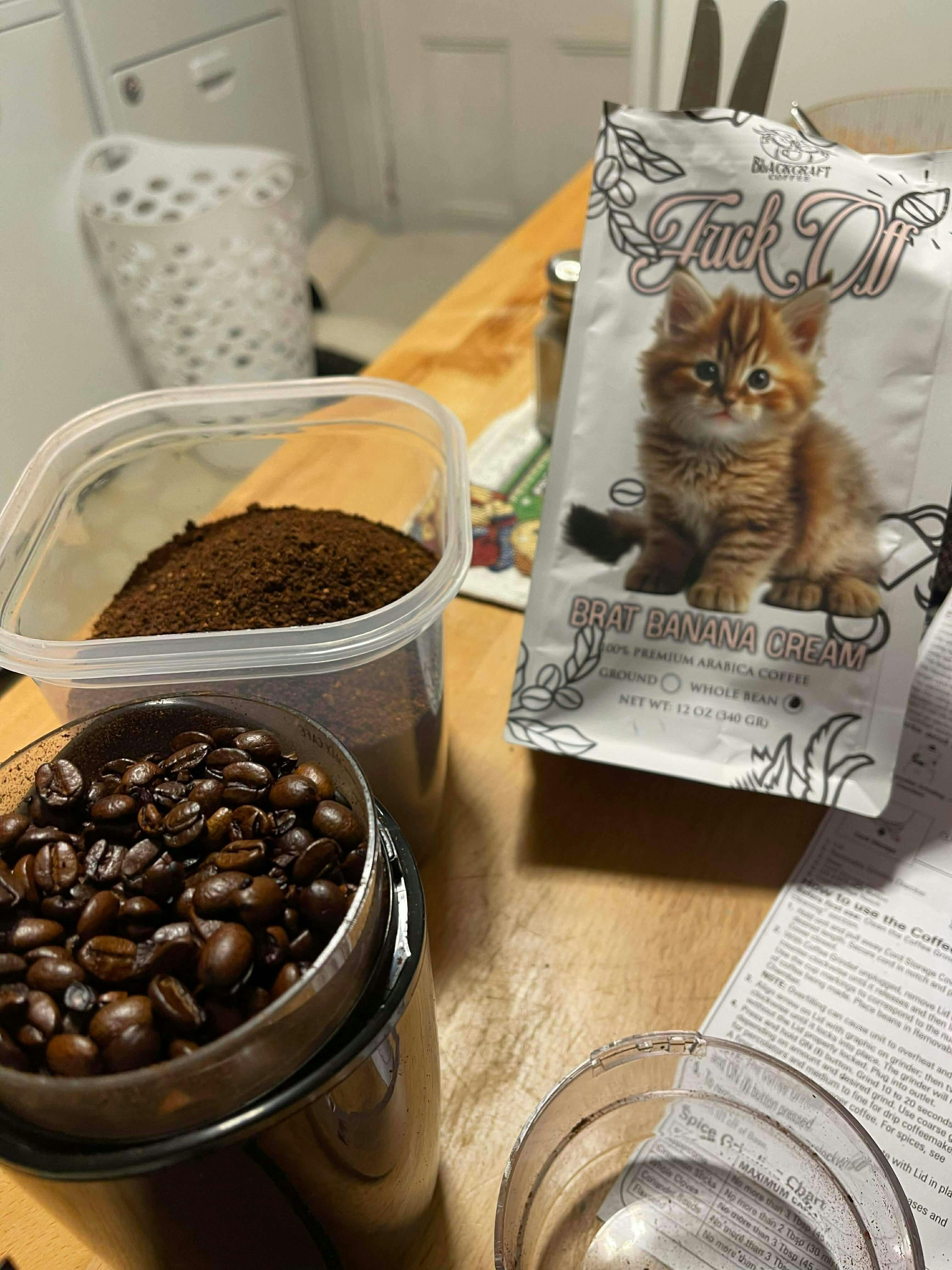 Blackcraft’s Brat Banana Cream Coffee! This bold blend features a rich, creamy banana flavor with a “fuck you” topping of whip cream.